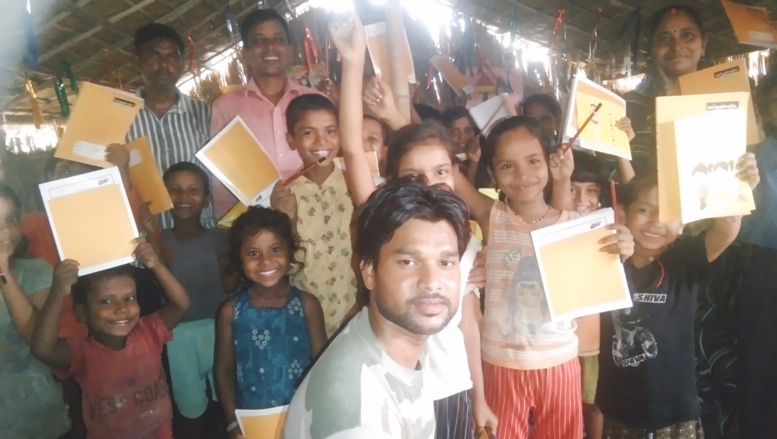 Villagers standing in front of their new community hut
